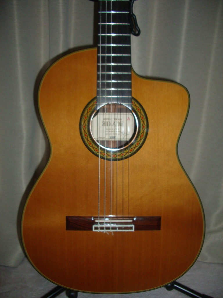 このHIRADEブランドは高級クラシックギターブランドとしての位置付けで、すべてのラインナップが全単板のギターになっています。現在販売されているこのギターと同様のスペックのギターはTH-5C($2299)となっており、プりアンプが改良されているようです。